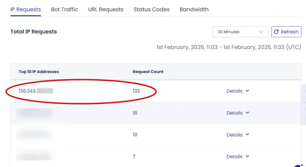 클라우드웨이즈를 이용한다면 애플리케이션 관리자 페이지의 Monitoring » Analytics » Traffic » IP Requests에서 지정된 시간(15초, 30초, 1분, 1시간, 1일) 동안 가장 많이 방문하는 상위 10개 IP 주소를 확인할 수 있습니다.