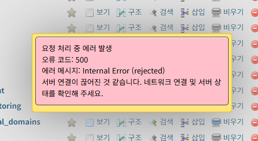하지만 DB 최적화를 시도하는 과정에서 500 에러가 발생했습니다.