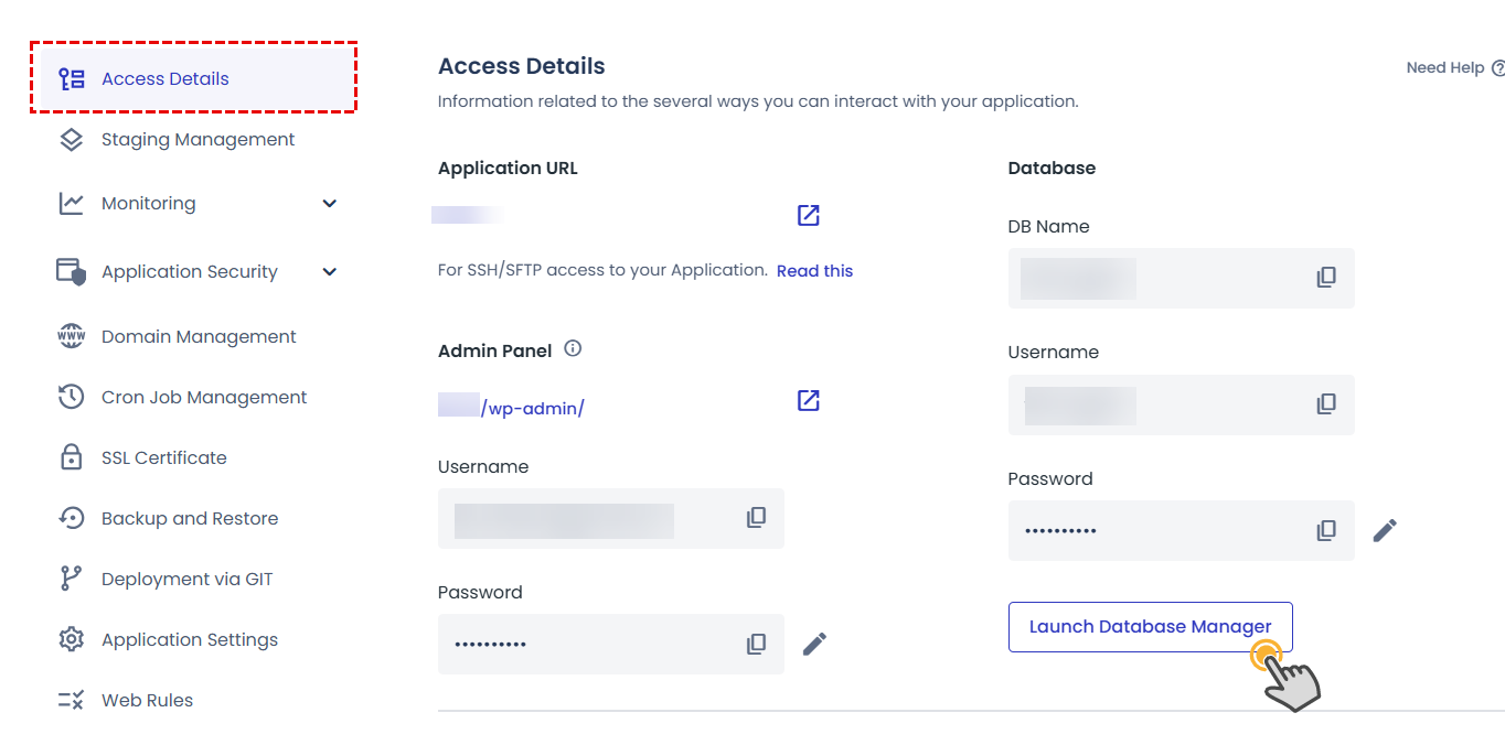 클라우드웨이즈에서 DB에 접속하려면 Access Details 페이지에서 Launch Database Manager 버튼을 클릭합니다.