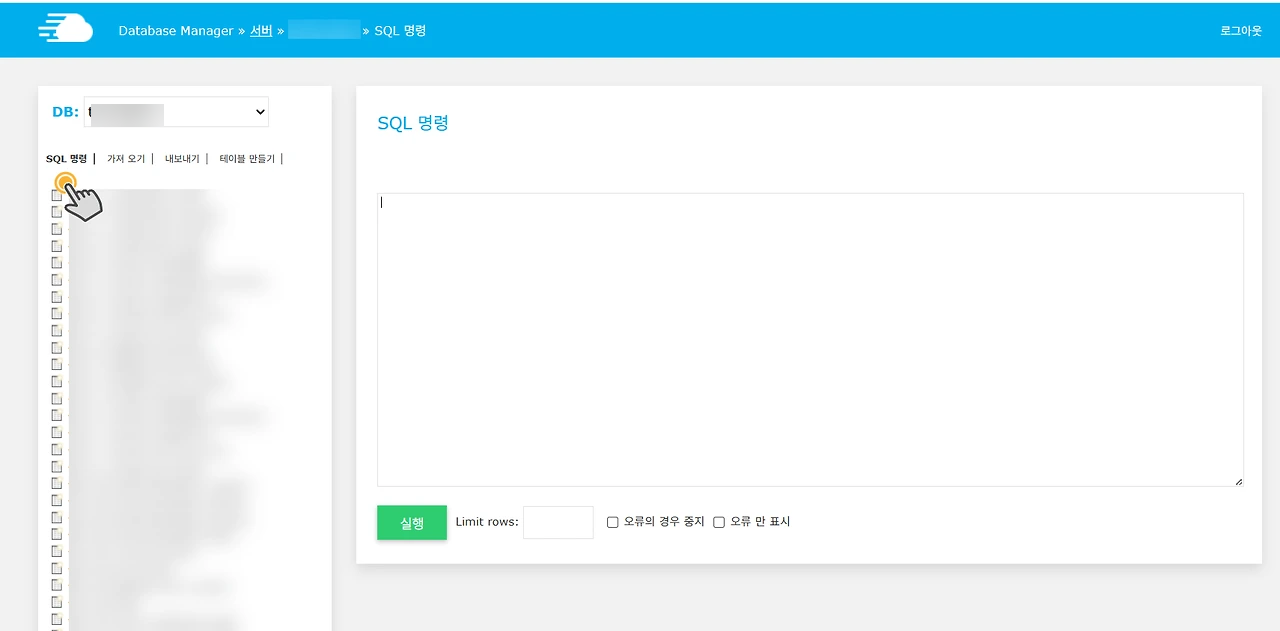 아래와 같은 DB 쿼리를 입력하고 실행 버튼을 클릭합니다. (👉 DB 작업은 되돌릴 수 없으므로 진행하기 전에 DB를 백업할 것을 권장합니다. 초보자인 경우 이 작업은 위험하므로 진행하지 않을 것을 권장합니다.)