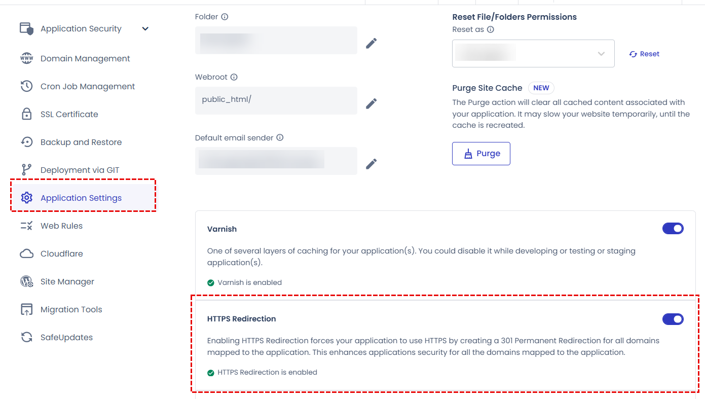 상기의 조치를 취해도 여전히 브라우저 창에 "주의 요함" 또는 "안전하지 않음" 경고가 표시된다면 Application Settings(애플리케이션 설정) » General (일반) 탭에서 HTTPS Redirection 옵션이 활성화되어 있는지 체크해 보시기 바랍니다.