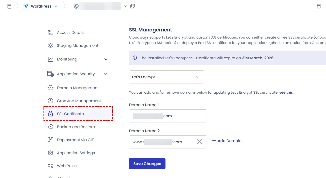 클라우드웨이즈에 애플리케이션(워드프레스 사이트)을 추가한 다음, 애플리케이션을 도메인을 연결하고 SSL 인증서를 설치할 수 있습니다.