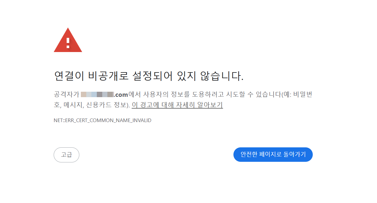 DNS 레코드를 수정하고 도메인을 연결한 후에 사이트에 접속하면 SSL 인증서 관련 오류(net::ERR_CERT_COMMON_NAME_INVALID)가 표시됩니다.