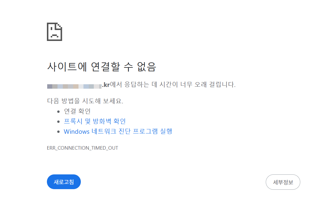 만약 3일의 체험 기간(Trial Period) 내에 유료로 전환하지 않아서 체험 기간이 만료되면 서버는 삭제되고, 사이트 접속이 차단됩니다. 사이트에 접속하면 아래 그림과 같이 ERR_CONNECTION_TIMED_OUT 오류가 발생합니다. (또는 다른 오류 화면이 표시될 수 있습니다.)