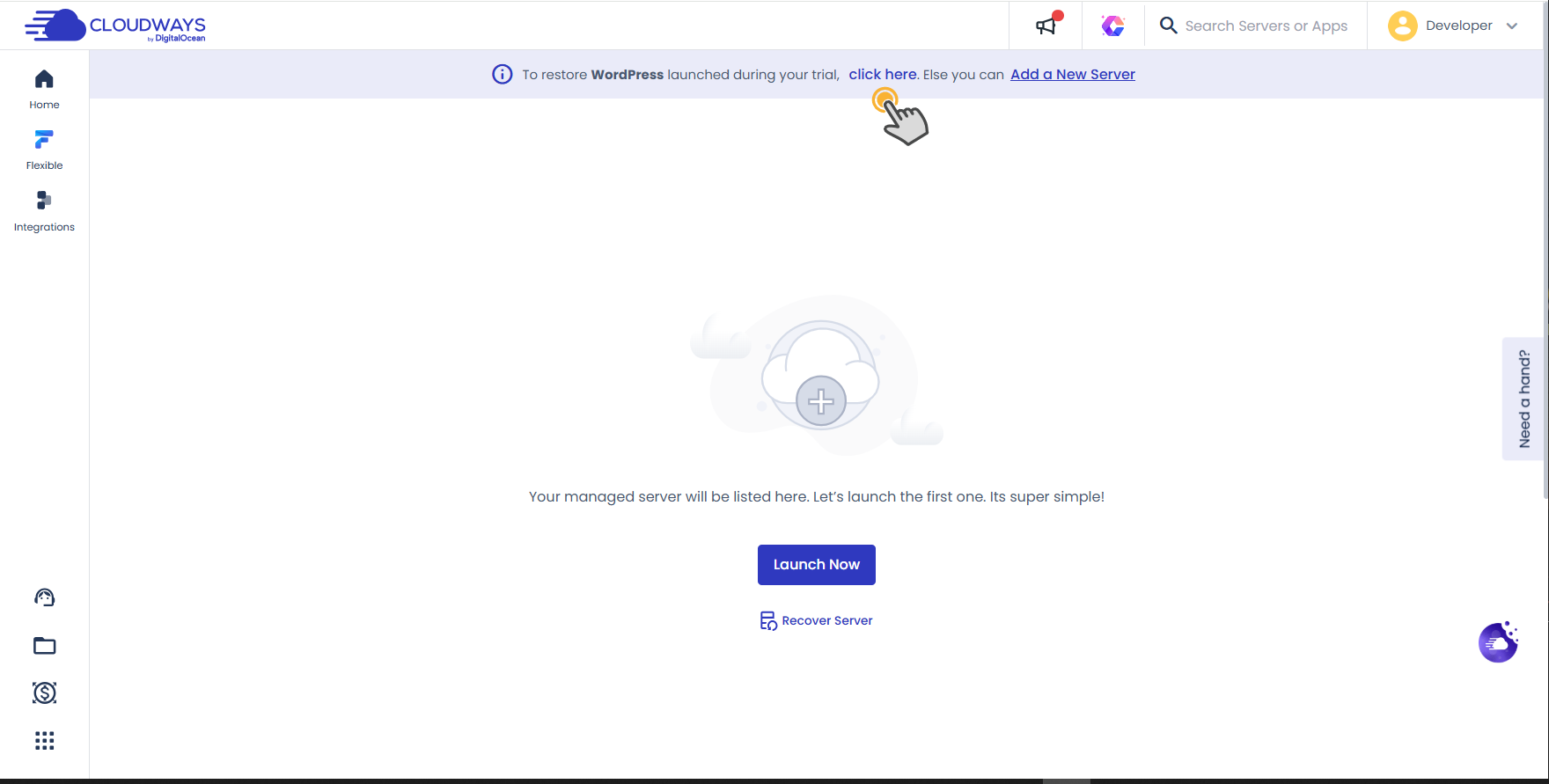클라우드웨이즈에 접속하면 아래 그림과 같이 "Your Flexible Trial Period has Expired. Upgrade to add new servers and applications, claim your free migration, unclock additional features and experience unparalleled speed" 메시지가 표시됩니다.