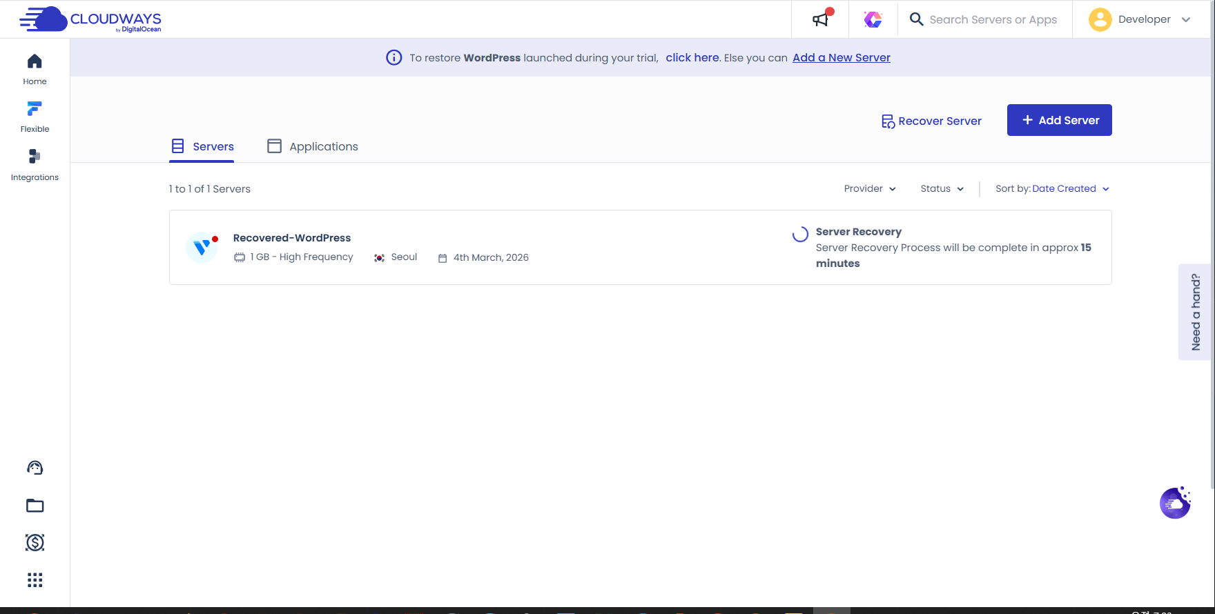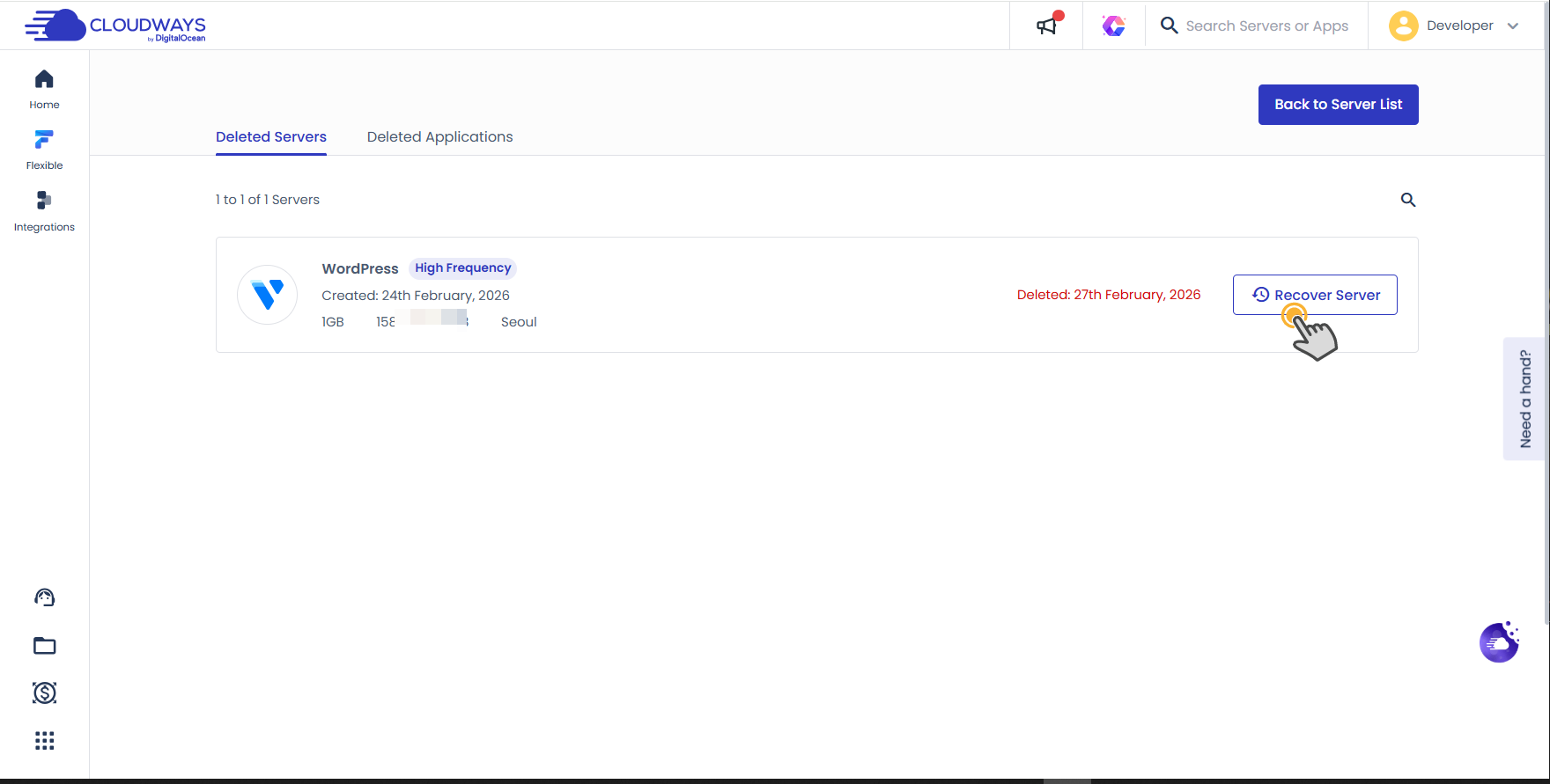 Deleted Servers 페이지가 표시되면 Recover Server 버튼을 클릭합니다.