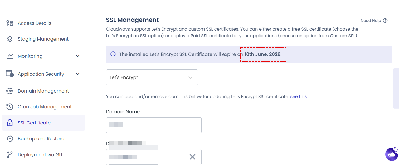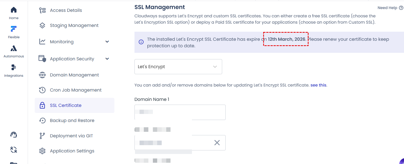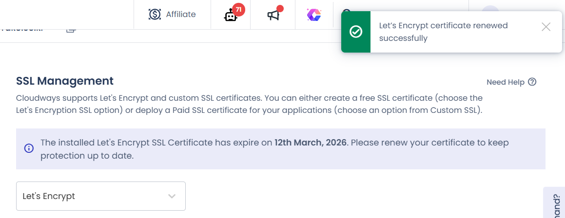 클라우드웨이즈의 SSL 인증서 설치 섹션에 방문하여 살펴보니 Let's Encrypt SSL 인증서가 이미 만료되었으므로 인증서를 갱신하라는 경고가 표시되고 있었습니다.