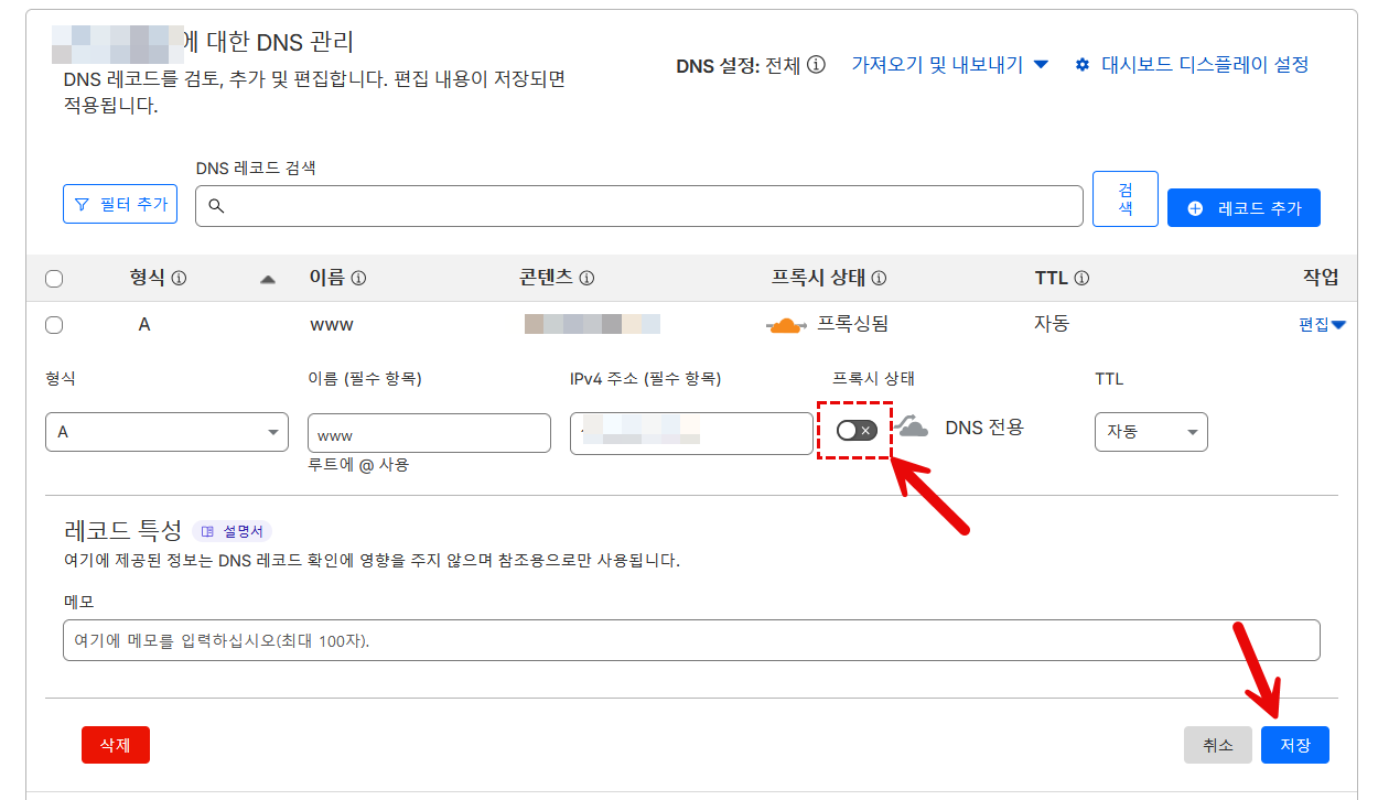 프록시됨을 클릭하여 DNS 전용으로 전환한 후에 저장 버튼을 클릭합니다.