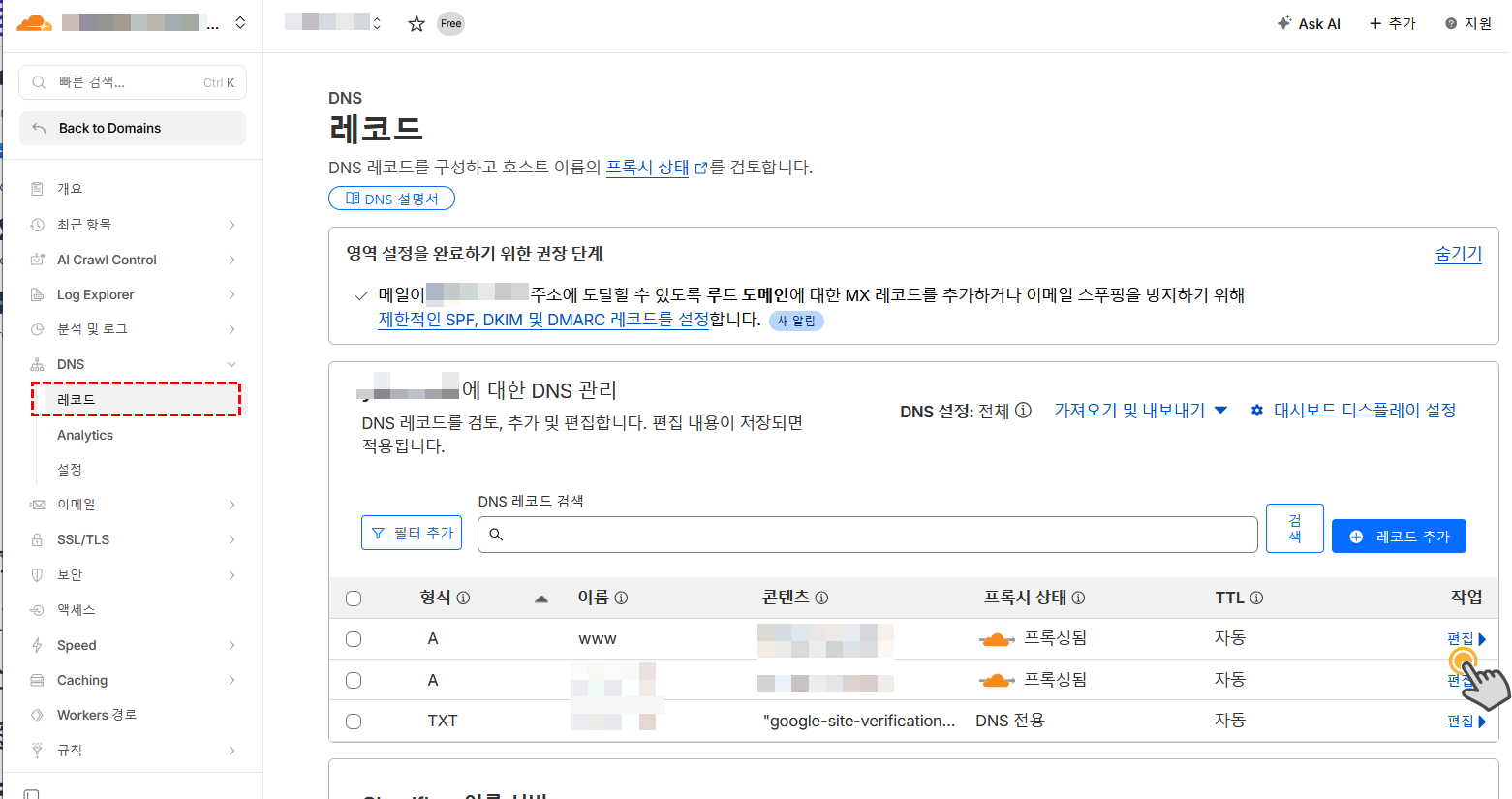 클라우드플레어를 계속 이용하고 싶다면 다시 도메인에 대하여 Proxy 활성화를 하면 됩니다.