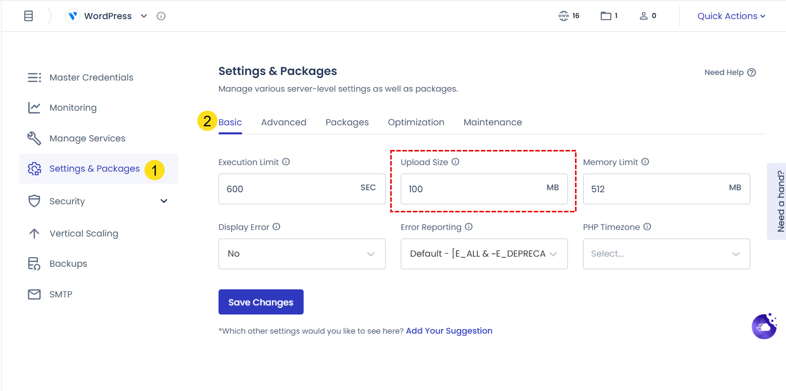 2. Settings & Packages » Basic에서 Upload Size를 변경하고 Save Changes 버튼을 클릭합니다.