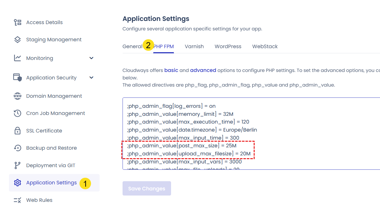 2. Application Settings » PHP FPM 탭으로 이동합니다.