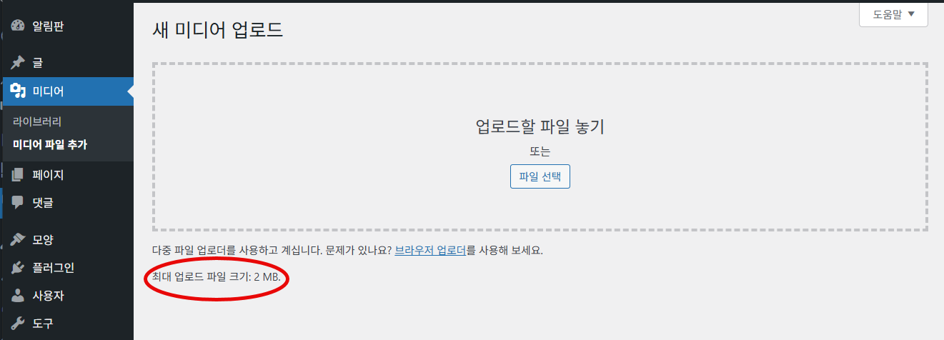 설정이 저장되면 업로드 크기가 설정한 값으로 변경되었는지 확인하세요. 변경되지 않고 2MB 또는 50MB로 표시된다면, 아래의 "애플리케이션 설정에서 업로드 크기 변경하기" 부분을 참고하여 변경을 시도해 보시기 바랍니다.