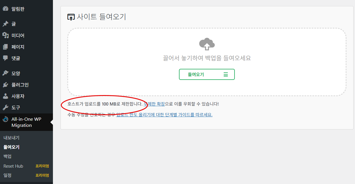 제대로 반영이 된다면, AIO WP Migration에서 위의 그림과 같이 "호스트가 업로드를 100 MB(설정한 크기)로 제한합니다"가 표시될 것입니다.