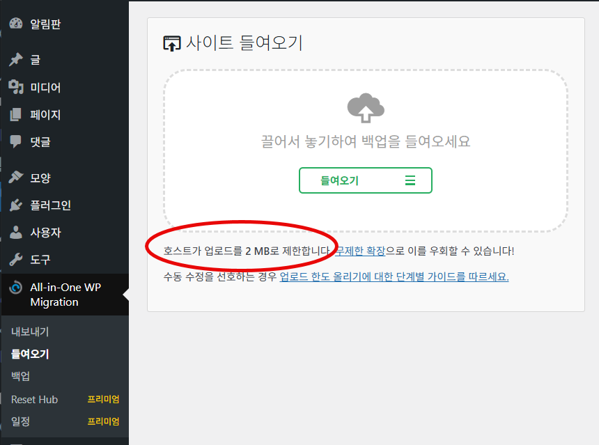 All-in-One WP Migration에서 업로드 크기가 2MB로 제한되어 백업 파일을 임포트하지 못하는 문제가 발생하기도 합니다("호스트가 업로드를 2 MB로 제한합니다"로 표시).