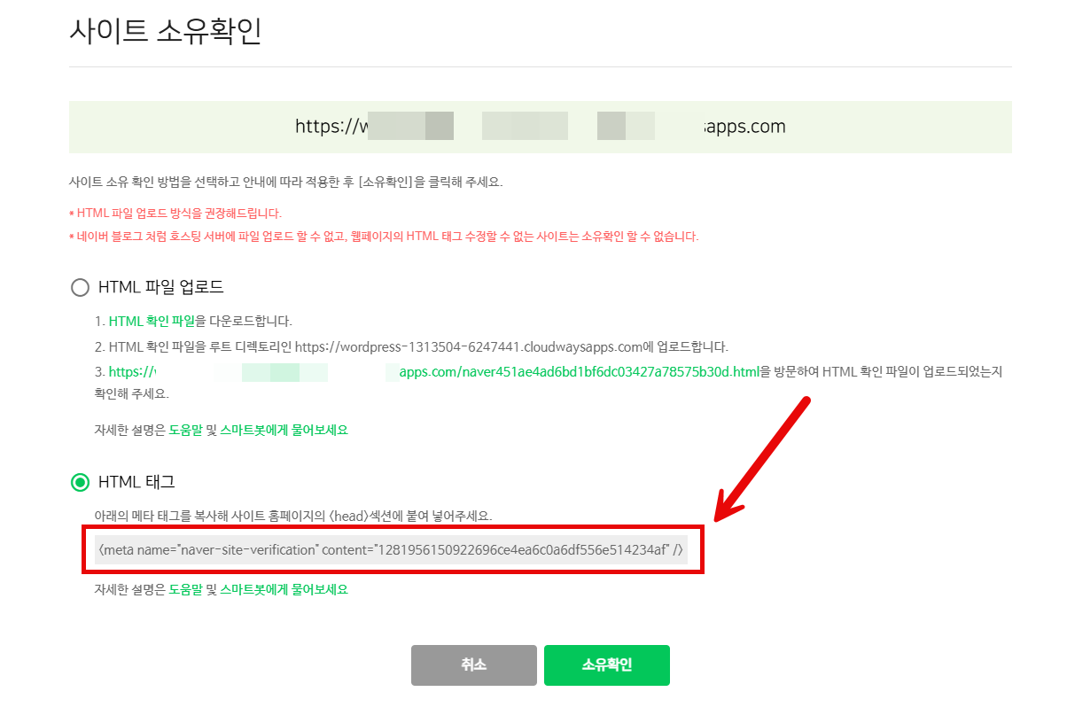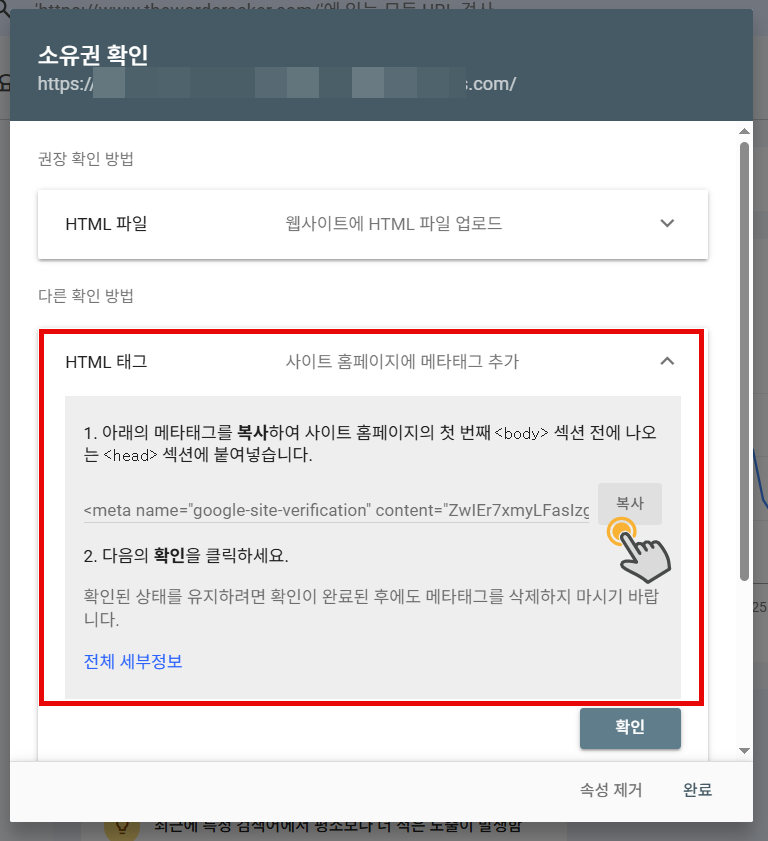 상기 그림과 같이 표시되면 복사 버튼을 클릭하여 메타 태그를 복사(Ctrl+C 단축키 사용)하도록 합니다.