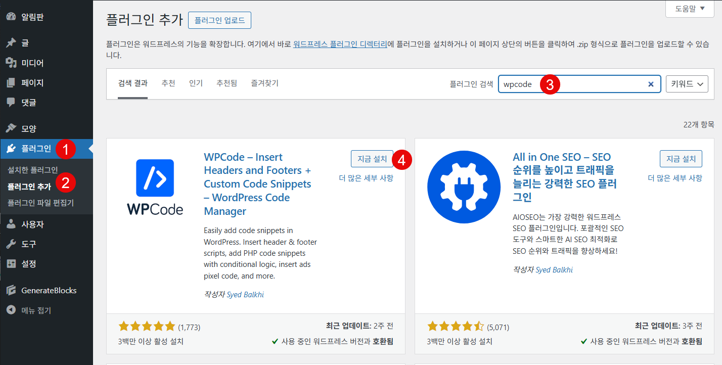 플러그인 → 플러그인 추가로 이동하고 wpcode로 검색하여 WPCode 플러그인을 설치하고 활성화합니다.