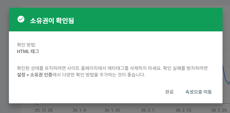 구글 서치 콘솔의 소유권 확인 팝업에서 확인 버튼을 클릭합니다. 잠시 기다리면 소유권이 확인됩니다.