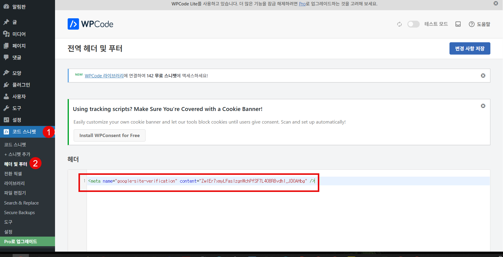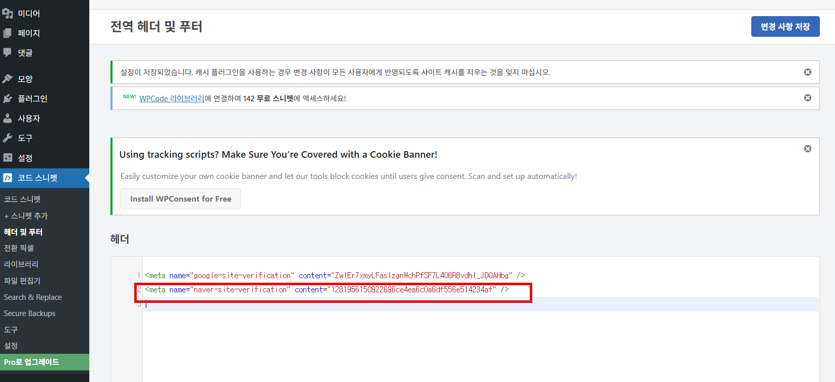 워드프레스에서 코드 스니펫 → 헤더 및 푸터로 이동하여 헤더 섹션에 메타 태그를 붙여넣기(Ctrl+V 단축키 사용) 합니다.