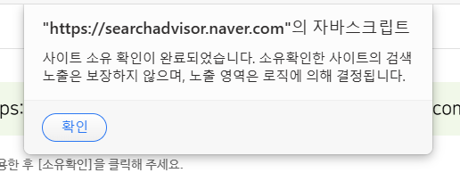 네이버 웹마스터 도구의 사이트 소유 확인 화면에서 소유 확인 버튼을 클릭합니다.