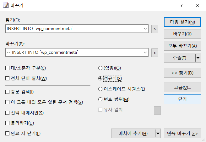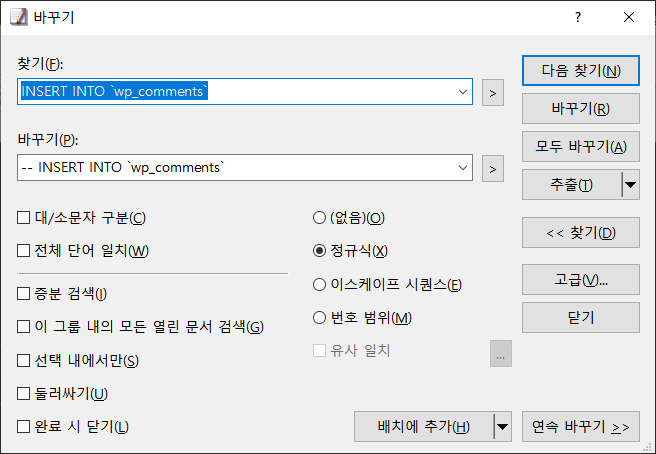 또 다른 방법으로 INSERT INTO `wp_commentmeta`...로 시작하는 라인을 모두 주석 처리하는 것도 생각해 볼 수 있습니다.
