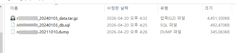 그림과 같이 1개의 데이터 파일과 2개의 DB 파일을 제공받았습니다. 데이터 파일은 2024년 1월에, DB 파일은 2024년 1월과 2021년 10월에 각각 백업한 것 같습니다.
