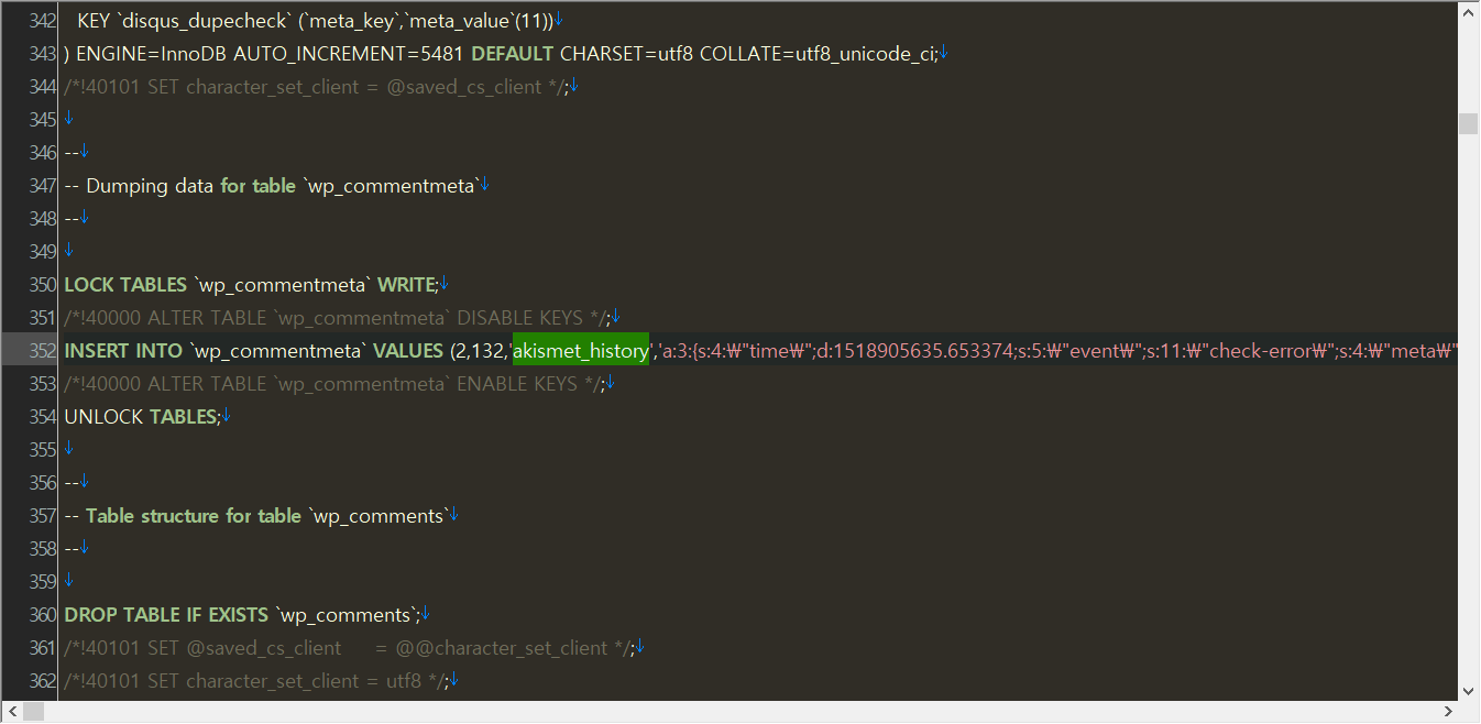 또한, INSERT INTO `wp_comments` VALUES...로 시작하는 라인들도 주석으로 처리할 수 있습니다.