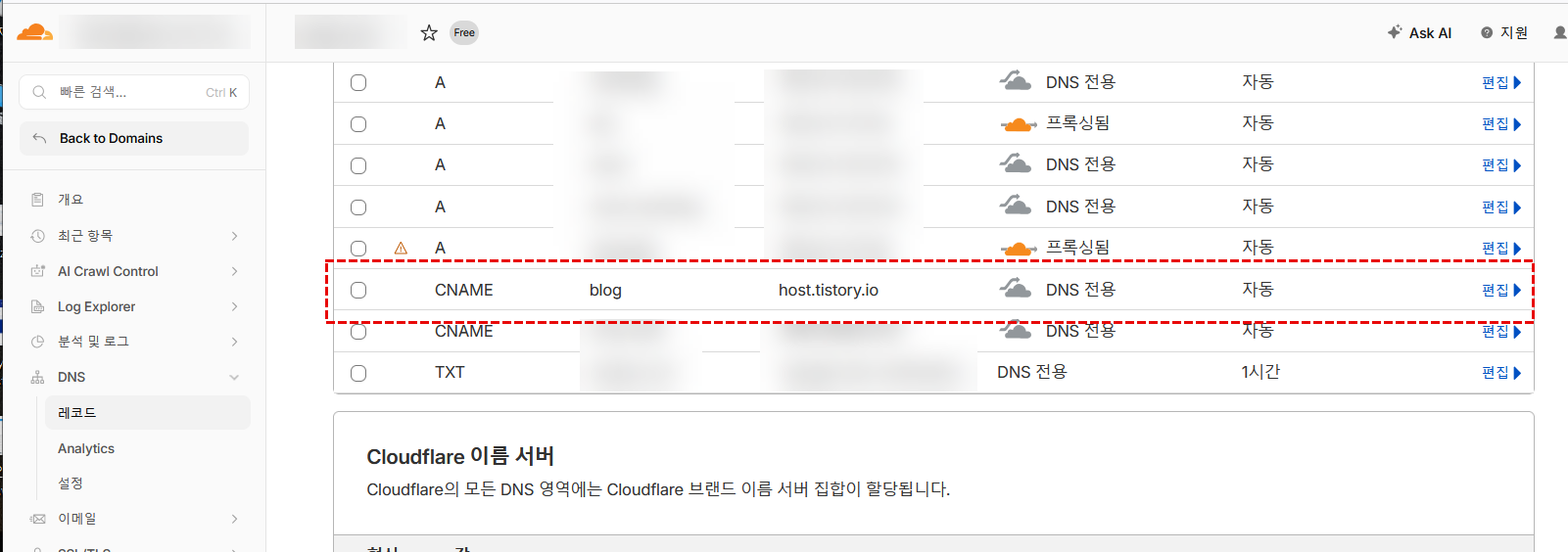 blog → host.tistory.io 또는 blog.tistory.com 중 하나 (CNAME 레코드)