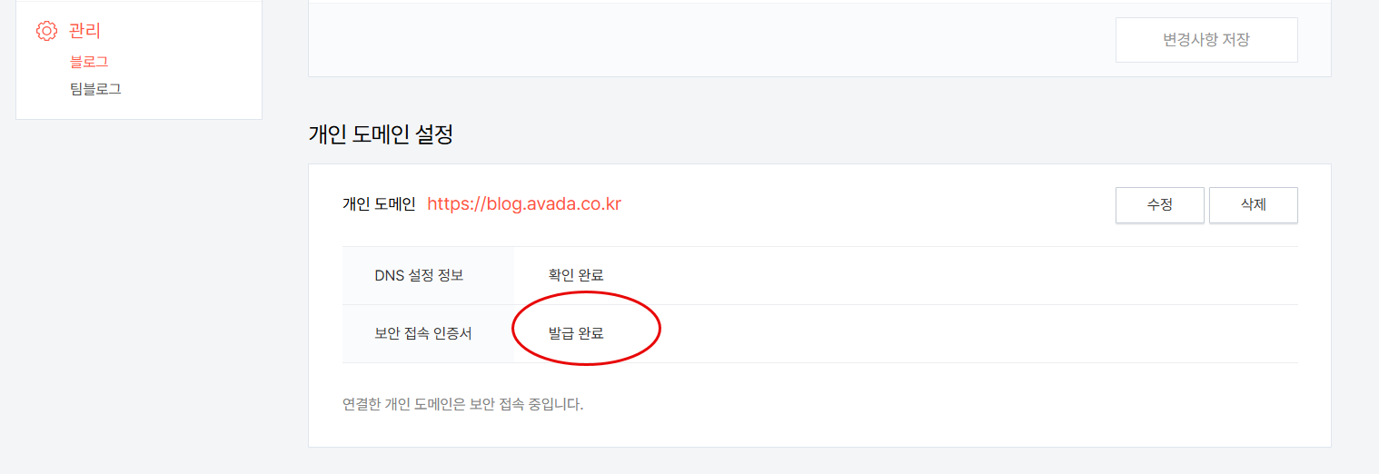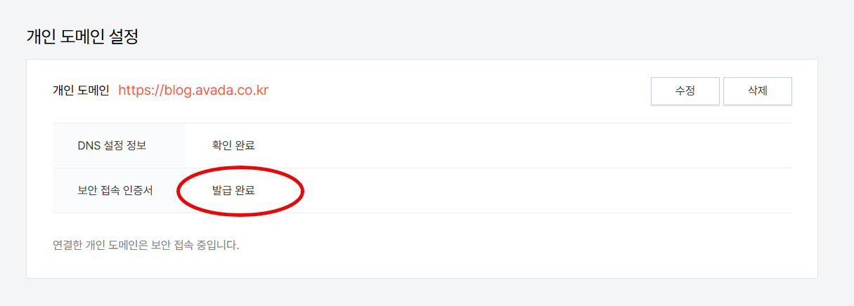 개인 도메인 연결 직후에는 발급 대기 중이라는 문구가 표시됩니다. 발급이 완료되면 위의 그림과 같이 발급 완료가 표시됩니다.