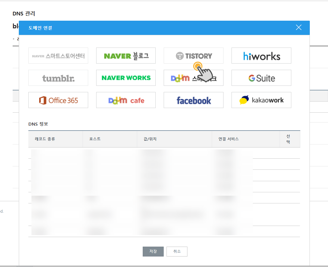 도메인 연결 팝업 화면이 표시됩니다. 아래 그림과 같은 화면이 표시될 것입니다. Tistory를 클릭하면 자동으로 CNAME 레코드가 지정됩니다.