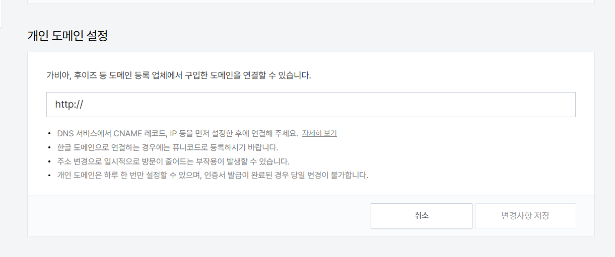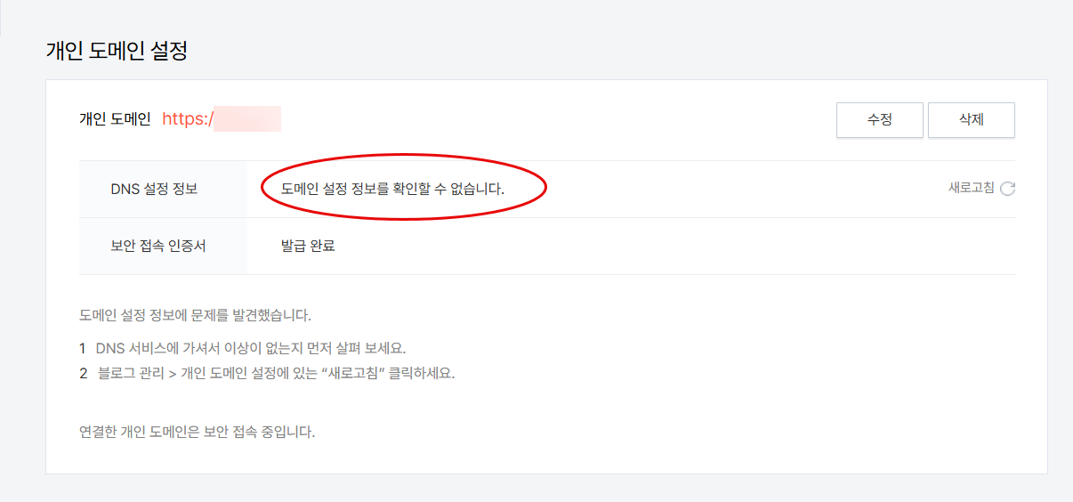 개인 도메인을 입력한 후에 도메인 DNS 레코드 설정이 되지 않았거나 충분히 전파되지 않았다면(전파되는 데 서너 시간에서 하루 정도 시간이 걸릴 수 있음) DNS 설정 정보 섹션에 '도메인 설정 정보를 확인할 수 없습니다' 에러가 표시됩니다.