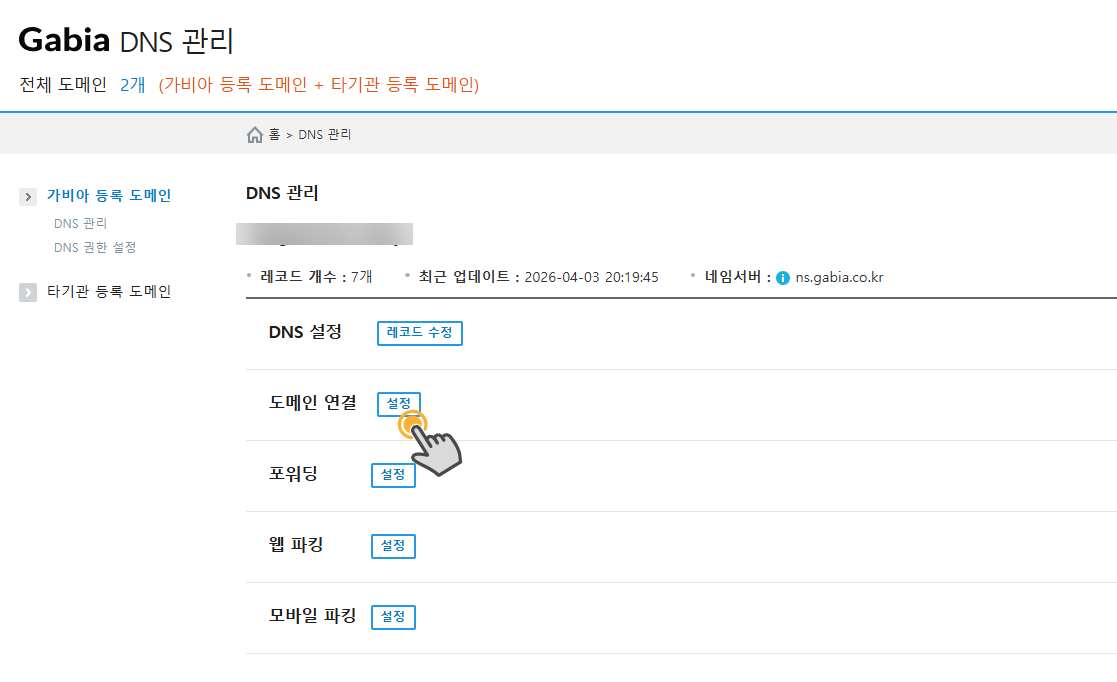 가비아의 DNS 관리에서 해당 도메인을 선택하고 도메인 연결 섹션의 설정 버튼을 클릭합니다.