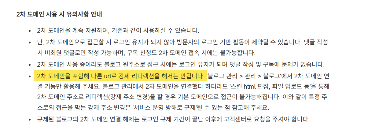 블로그를 시작하는 단계라면 처음부터 2차 도메인을 연결하는 것이 바람직합니다. 하지만 블로그를 운영하고 있고 방문자 수가 제법 많은 경우에는 개인 도메인 연결에 신중해야 합니다.