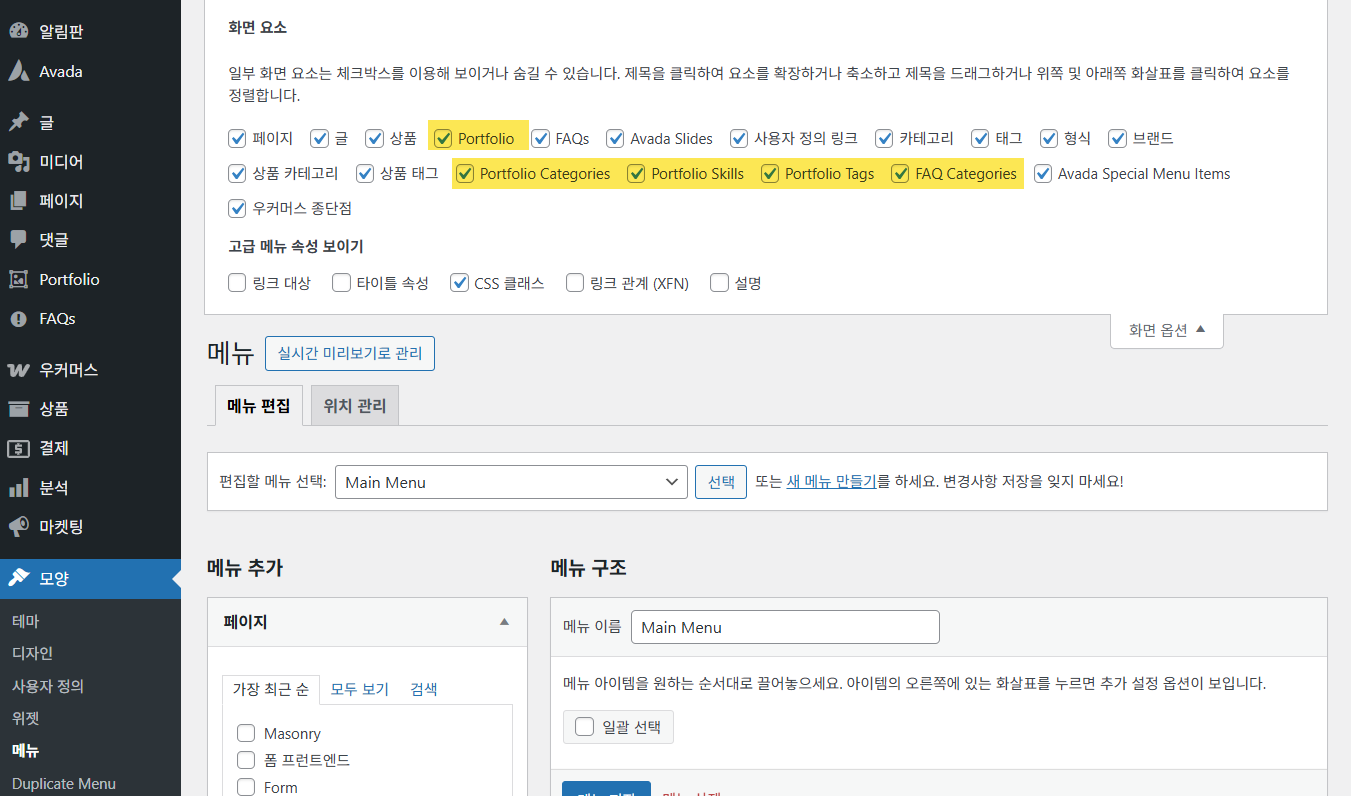 포트폴리오(Portfolio) 등 커스텀 포스트 타입 글이나 커스텀 포스트 타입 카테고리/태그가 메뉴 항목에서 선택할 수 없는 경우에도 동일한 방법으로 표시할 수 있습니다. 예를 들어, 베스트셀링 테마인 아바다 테마의 Portfolio 카테고리를 표시하려고 하지만 메뉴에서 찾을 수 없는 경우 화면 옵션에서 포트폴리오 카테고리를 체크하여 표시되도록 할 수 있습니다.