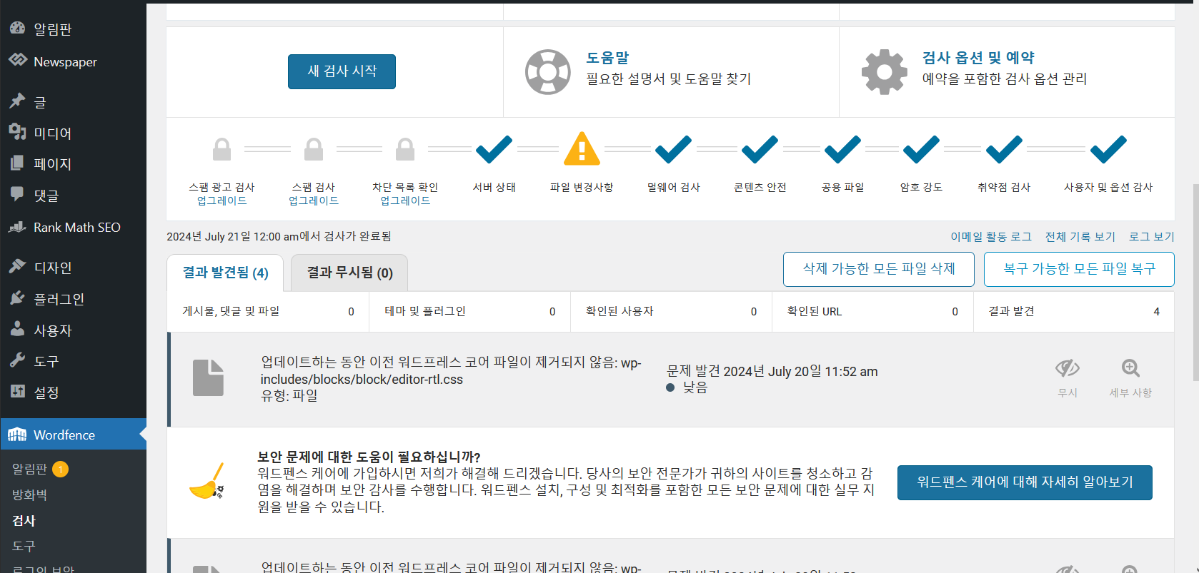 워드프레스가 최근 6.6 버전으로 업데이트되었습니다. 워드프레스를 최신 버전으로 업데이트한 후에 Wordfence에서 "업데이트하는 동안 이전 워드프레스 코드 파일이 제거되지 않음" 경고를 보내왔습니다.총 4개 파일에 대하여 업데이트 과정에서 워드프레스 코어 파일이 제거되지 않은 문제가 발생했습니다."업데이트하는 동안 이전 워드프레스 코어 파일이 제거되지 않음" 경고워드프레스 보안을 위해 Wordfence와 같은 보안 플러그인을 설치하면 보안 강화에 도움이 됩니다. 특히 보안 취약점을 검사하는 기능이 탑재되어 있으므로 보안 취약점을 스캔하여 문제가 되는 사항을 시정하는 데 도움이 됩니다.참고로 멀웨어(악성코드)에 감염된 파일들을 제거하려는 경우에도 워드펜스 플러그인을 사용할 수 있습니다. 하지만 이미 악..