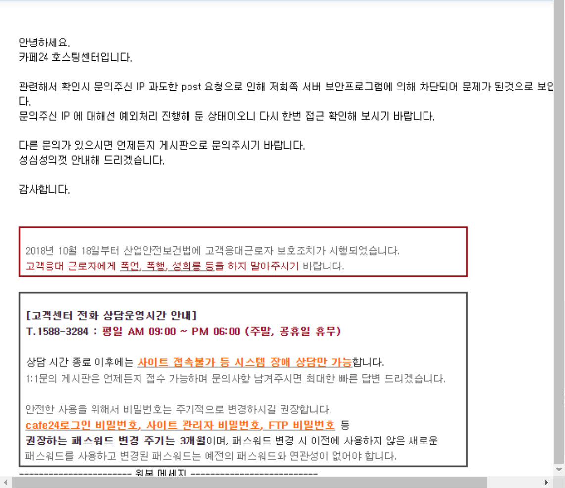 카페24 호스팅을 이용하는 워드프레스 사이트에서 관리자 페이지에 로그인을 시도할 때 로그인이 되지 않는 경우가 있을 수 있습니다. 카페24에서 워드프레스 관리자 페이지에 로그인할 수 없는 경우 워드프레스 자체의 문제일 수도 있지만, 경우에 따라 카페24의 방화벽 때문에 로그인이 차단되는 경우도 있습니다. 카페24: 워드프레스 관리자 페이지에 로그인이 안 되는 경우 확인 사항 해외에서 워드프레스 관리자 페이지 접속 불가능 해외에서 카페24에서 호스팅되는 워드프레스 사이트의 관리자 페이지에 로그인을 시도하면 아래 그림과 같이 404 Forbidden 에러가 발생하면서 "You don't have permission to access /wp-admin/ on this server" 오류가 표시됩니다. 이 문제..