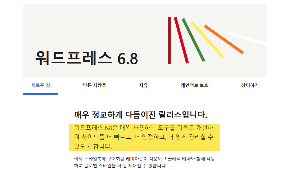 우리나라 시각으로 어제 2025년 4월 16일 오전에 워드프레스 6.8 업데이트가 공개되었습니다. 이번 버전은 2025년 들어 공개된 첫 번째 메이저 릴리스입니다. 이번 업데이트에서는 새로운 기능을 추가하기보다는 속도와 보안 향상에 중점을 둔 것 같습니다. 아직 워드프레스 버전을 최신 버전으로 업데이트하지 않은 경우 새 버전으로 업데이트하여 안전하게 워드프레스 사이트를 운영하시기 바랍니다.워드프레스 6.8 업데이트 릴리스 - 속도와 보안, 사용 편의성 향상워드프레스 6.8은 속도와 보안 등에 중점을 두고 기능이 개선된 것 같습니다. 실제로 업데이트 후에 사이트 속도가 개선되었다고 하는 네이버 카페 게시글에 답글을 다신 분이 계시네요.😄워드프레스 사이트 속도는 여러 가지 요소의 영향을 받습니다. 가벼운 ..