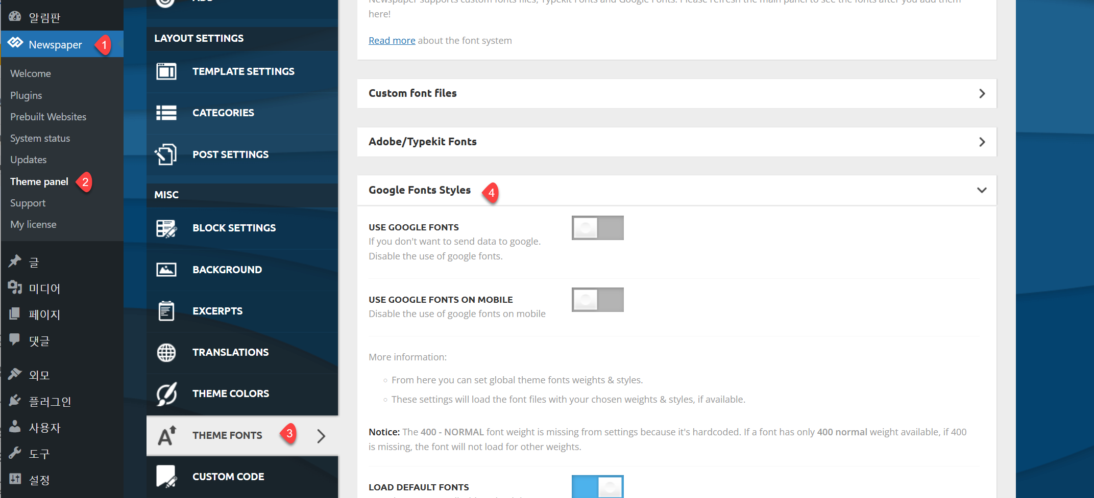 워드프레스 뉴스페이퍼 테마 구글 폰트 비활성화하기