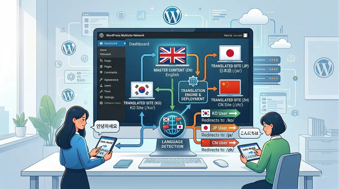 워드프레스로 다국어 사이트를 운영하는 방법으로 WPML과 같은 플러그인을 사용하거나 멀티사이트로 영어, 일본어, 중국어 등의 언어 사이트를 추가할 수 있습니다. WPML은 유료 플러그인으로 매년 구독료가 나가는 반면, 멀티사이트는 추가적인 비용이 나가지 않습니다. 다만, 언어 페이지 간 매핑이 필요한 경우 WordPress Multilingual Multisite와 같은 유료 플러그인을 구입해야 합니다. 이 플러그인은 1개 사이트에 대하여 1회 결제로 영구적으로 사용이 가능하므로 비용 부담이 적은 편입니다.클라이언트로부터 영문으로 제작된 사이트를 멀티사이트로 구성하고 동일한 콘텐츠로 일본어 사이트를 추가하는 작업을 의뢰받았습니다. 그리고 특정 페이지에서 언어 선택기의 언어를 선택하면 해당 페이지에 대응하..