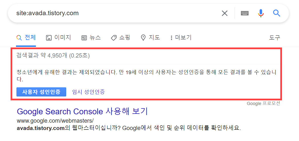 구글에서 "site:사이트주소"로 이 블로그를 검색하면 "청소년에게 유해한 결과는 제외되었습니다. 만 19세 이상의 사용자는 성인인증을 통해 모든 결과를 볼 수 있습니다" 경고가 표시됩니다. 로그인 상태에서 검색해보면 사용자 인증 경고가 표시되지 않습니다. 이 블로그의 경우 검색 결과에서 (11,600개 vs. 4,950개로) 절반 정도가 청소년 유해 콘텐츠로 차단되고 있는 것 같습니다. 구글 검색 시 "청소년에게 유해한 결과는 제외되었습니다" 경고가 표시되는 문제 이 문제는 한국 구글에서만 발생하는 문제이고 구글이 한국법을 준수하려고 하다 보니 알고리즘상 필터링을 조금 과하게 적용해서 이런 현상이 나타날 수 있다고 합니다. 하지만 site:naver.com으로 검색해보면 이런 현상이 발생하지 않습니다...