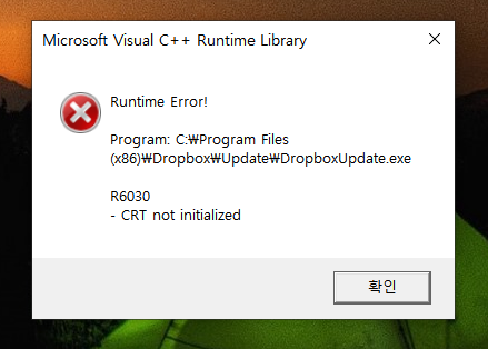Dropbox는 2007년 드류 휴스턴과 아라시 페르도시가 설립한 클라우드 기반 파일 동기화 및 공유 서비스로서 사용자가 컴퓨터, 휴대폰, 태블릿 등 다양한 기기에서 파일을 쉽게 저장하고 동기화할 수 있게 합니다. 드롭박스는 한 계정당 무료로 2GB의 저장 공간을 제공하며, 윈도우, macOS, 리눅스, iOS, 안드로이드 등 다양한 플랫폼을 지원합니다. 오늘 윈도우를 시작할 때 갑자기 Microsoft Visual C++ Runtime Library Runtime Error! Program: C:\Program Files(x86)\Dropbox\Update\DropboxUpdate.exe R6030 - CRT not intialized 오류가 발생했습니다. 이 문제를 검색해 보니 윈도우 10과 윈도우 ..