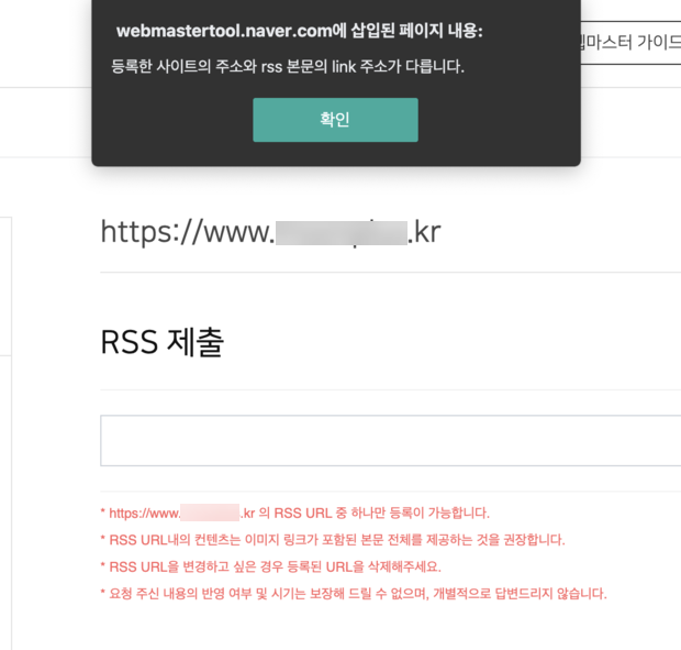 네이버 서치어드바이저(네이버 웹마스터 도구)에서 RSS 피드를 제출할 때 "webmasterool.naver.com에 삽입된 페이지 내용: 등록한 사이트의 주소와 rss 본문의 link 주소가 다릅니다." 오류가 발생하면서 RSS를 제출할 수 없는 문제가 발생하는 경우가 있습니다. 네이버 서치어드바이저 (네이버 웹마스터 도구)에서 '등록한 사이트의 주소와 rss 본문의 link 주소가 다릅니다' 오류가 발생할 경우 확인 사항 이 오류는 오류 메시지에서 알 수 있듯이 네이버 웹마스터 도구에 등록한 사이트 주소와 RSS 필드 내의 링크 주소가 다른 경우에 발생합니다. 가장 흔한 예가 www 주소와 non-www 주소 때문에 발생하며, 네이버에서는 www 주소(예: www.example.co.kr)와 non-..