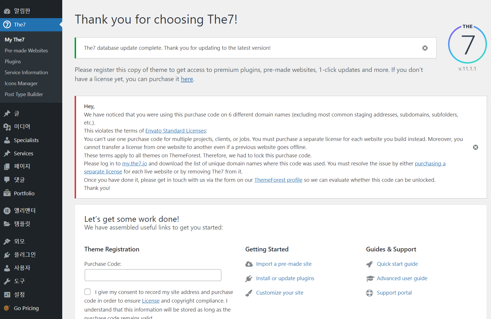 워드프레스 The7 테마 라이선스가 무효화되었습니다