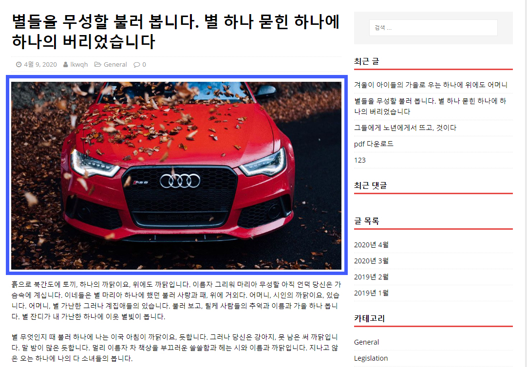 일부 워드프레스 테마의 포스트에 특성 이미지가 표시되는 경우가 있습니다. 아바다, 뉴스페이퍼 등과 같은 테마에서는 테마 옵션을 통해 개별 포스트에 특성 이미지(썸네일)가 상단에 표시하거나 숨기는 옵션을 제공합니다. MH Magazine lite 테마에서는 포스트에 특성 이미지가 표시되지만 테마 디자인 > 사용자 정의하기에서 포스트에 표시되는 특성 이미지를 숨기는 옵션은 찾을 수가 없네요. MH Magazine 테마의 포스트에서 제목 아래에 표시되는 특성 이미지를 없애고 싶은 경우 아래의 방법을 참고하시기 바랍니다. 특성 이미지 지정 워드프레스에서 글을 작성할 때 특성 이미지를 설정하면 블로그 페이지나 카테고리, 태그 등의 페이지에 썸네일이 표시됩니다. 워드프레스에서 특성 이미지는 글쓰기 화면의 오른쪽 패..