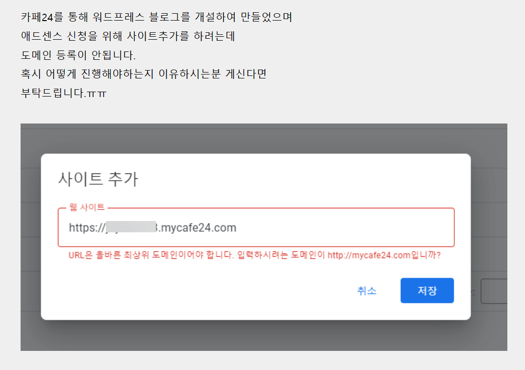 기본 도메인(example.com) 대신 서브도메인(blog.example.com)만 구글 애드센스를 신청하여 승인을 받을 수 있는지 궁금해하시는 분들이 간혹 계십니다. 결론부터 말하지만 메인 도메인 대신 서브도메인만 애드센스 승인 신청을 하는 것은 가능하지 않습니다.서브도메인에만 구글 애드센스 광고 승인을 받을 수 있을까?카페24에서 호스팅 상품에 가입하면 카페24의 임시 도메인(예: example.mycafe24.com)이 부여됩니다. 카페24 임시 도메인을 애드센스 계정에서 사이트 추가하면 "URL은 올바른 최상위 도메인이어야 합니다. 입력하시려는 도메인이 http://mycafe24.com입니까?" 메시지가 표시되면서 사이트 추가가 되지 않습니다. (아래는 워드프레스 관련 네이버 카페에 올라온 질..