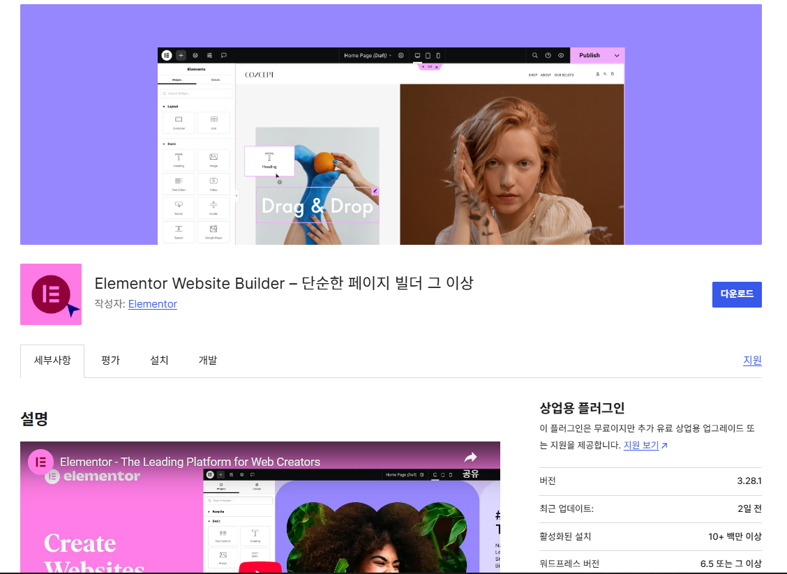 엘리멘터(Elmentor)는 1,000만 개가 넘는 사이트에 설치되어 사용되고 있는 인기 워드프레스 페이지 빌더 플러그인입니다. 엘리멘터는 무료 버전과 프로 버전으로 제공됩니다. Elementor 프로 버전에서는 프로 템플릿과 프로 위젯, 그리고 컨택트 폼 등의 기능이 제공되고, 무엇보다 테마 빌더(Theme Builder)가 탑재되어 헤더부터 푸터까지 사이트의 모든 섹션을 워드프레스 알림판에서 커스텀하는 것이 가능합니다. 예를 들어, 블로그 포스트 템플릿이나 상품 상세 페이지 템플릿을 만들어 블로그 포스트나 상품 페이지를 원하는 대로 꾸밀 수 있습니다. 워드프레스 엘리멘터 테마 빌더로 포스트 템플릿 만들기엘리멘터는 현재 500만 개가 넘는 사이트에 설치되어 사용되고 있는 인기 워드프레스 페이지 빌더입니..