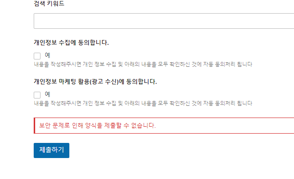 워드프레스 인기 문의폼 플러그인인 WPForms 플러그인으로 만든 양식에서 보내기 버튼을 누를 때 "보안 문제로 인해 양식을 제출할 수 없습니다" 오류가 발생하는 경우가 있습니다. 이 오류가 모든 사용자에게 표시되지 않고 일부 사용자에게만 나타날 수 있습니다.워드프레스 WPForms 플러그인: "보안 문제로 인해 양식을 제출할 수 없습니다 "오류가 발생하는 경우카페24에 설치된 워드프레스에서 WPForms로 제작된 양식을 제출할 때 "보안 문제로 인해 양식을 제출할 수 없습니다(The form could not be submitted due to a security issue) 에러가 표시되면서 양식이 제출되지 않는 현상이 발생했습니다.또한, 다음과 같은 에러 코드가 표시되었습니다.{"code":"res..