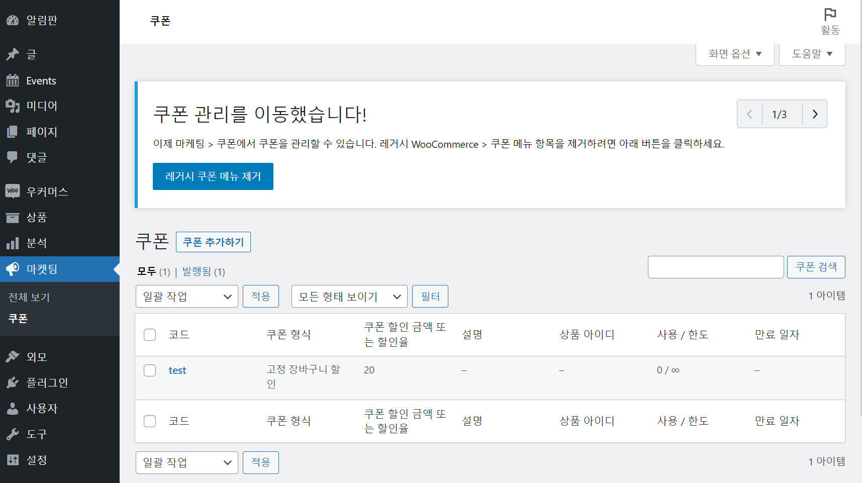 우커머스 쿠폰 메뉴는 마케팅 메뉴 아래, 즉 워드프레스 관리자 페이지 » 마케팅 » 쿠폰에 위치하고 있습니다. 만약 마케팅 메뉴 아래에 쿠폰 항목이 없는 경우 우커머스 설정에서 쿠폰을 활성화해야 합니다. 워드프레스 우커머스: 쿠폰 메뉴가 표시되지 않는 경우 마케팅 메뉴 아래에 쿠폰이 표시되지 않으면 우커머스 » 설정 » 일반 탭으로 이동하여 쿠폰 사용 활성화 옵션의 쿠폰 코드 사용 활성화 체크박스가 선택되어 있는지 확인하시기 바랍니다. 위의 그림과 같이 쿠폰 코드 사용 활성화가 체크되어 있지 않다면 선택란을 체크하여 활성화하면 마케팅 메뉴에 쿠폰이 표시될 것입니다. 위의 조치에도 쿠폰 메뉴가 표시되지 않는 경우... 쿠폰 코드 사용 활성화를 체크해도 문제가 해결되지 않으면 다음과 같은 조치를 취하여 문제..
