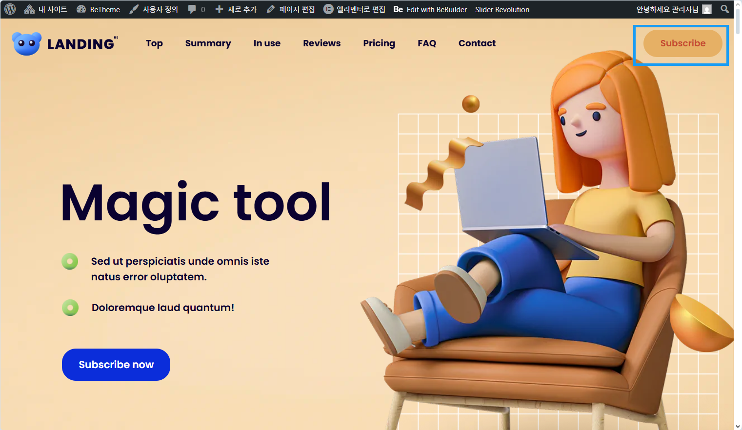 워드프레스 Betheme 테마 데모 설치 및 Subscribe 메뉴 버튼 변경