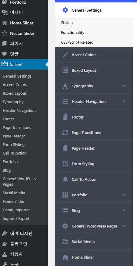 워드프레스 Salient 테마는 현재 Themeforest 마켓에서 판매 10위를 기록하고 인기 테마 중 하나입니다. 개인적으로는 이 테마의 포트폴리오(Portfolio)를 좋아하는 편입니다. 아바다, 엔폴드 등 대부분의 유료 테마에서는 포트폴리오(혹은 프로젝트) 커스텀 포스트 타입을 제공합니다. 워드프레스 Avada 테마에서 포트폴리오 설정하기 Enfold 테마에서 포트폴리오를 사용하는 방법 Salient 테마를 설치하고 활성화하면 관리자 페이지의 메뉴에 Salient 메뉴 항목이 추가되고 다양한 메뉴 옵션이 제공됩니다. 이 테마에서 Back To Top (위로 이동) 버튼은 기본적으로 설정되어 있습니다. 이 버튼은 Salient > General Sttings > Functionality에서 설정하거..