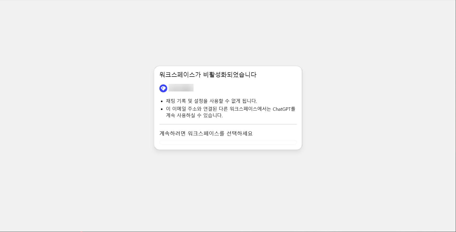 챗GPT를 실행할 때 "워크스페이스가 비활성화되었습니다" 경고창이 표시되면서 접속하지 못하는 문제가 발생하는 경우가 있을 수 있습니다. 이 오류는 개인 계정에서는 거의 나타나지 않고 보통 ChatGPT 팀(Team) 또는 엔터프라이즈(Enterprise) 계정에서 사용자가 속한 워크스페이스가 관리자에 의해 사용 중지되었을 때 나타납니다.저는 이 경고가 표시되면서 챗GPT 계정에 접근하지 못하는 현상이 발생했습니다. 계속 재로드 해도 해결이 안 되고, 챗GPT 앱에서도 동일한 현상이 발생했습니다.워크스페이스 비활성화 경고로 인해 챗GPT에 접근(로그인)하지 못하는 문제를 해결하는 방법에 대하여 살펴보겠습니다.챗GPT "워크스페이스가 비활성화되었습니다" 오류챗GPT에는 개인 요금제와 비즈니스 요금제가 있습니..